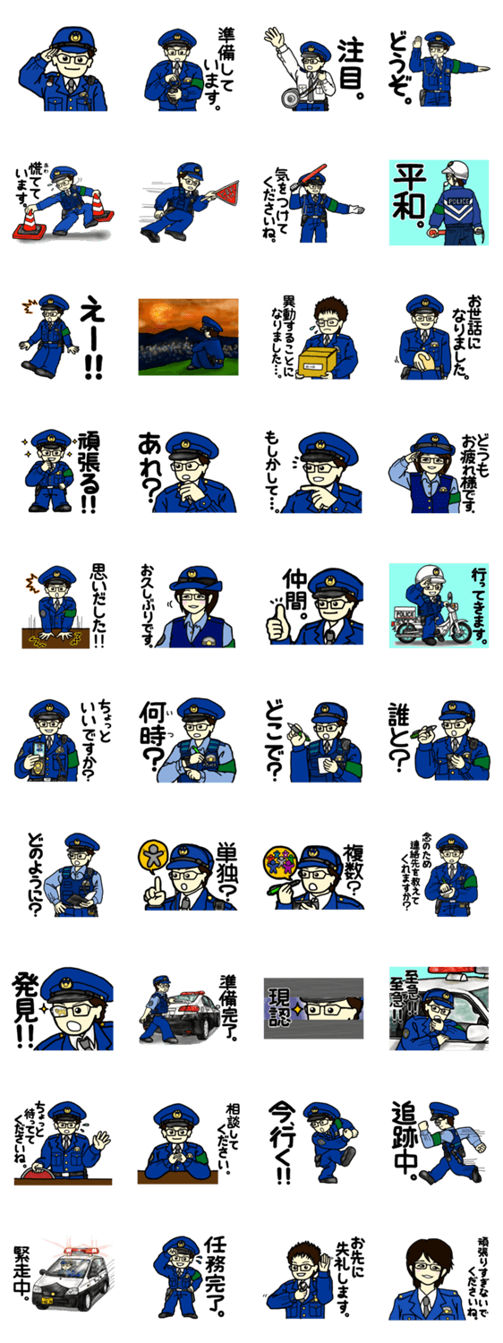 | スタンプ説明 | 地域の安全を守り治安維持をするために活躍する警察官を描きました。高橋巡査の交番勤務日誌、その4です。 |