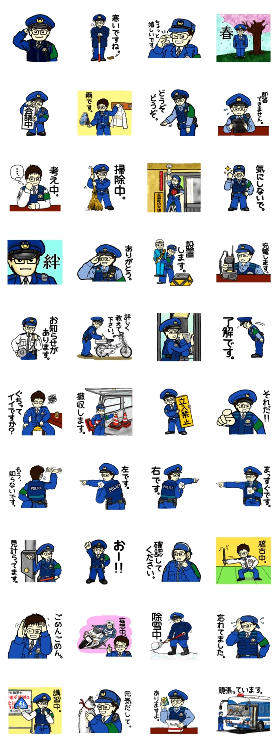 | スタンプ説明 | 地域の安全を守り治安維持をするために活躍する警察官を描きました。高橋巡査の交番勤務日誌、その3です。 |