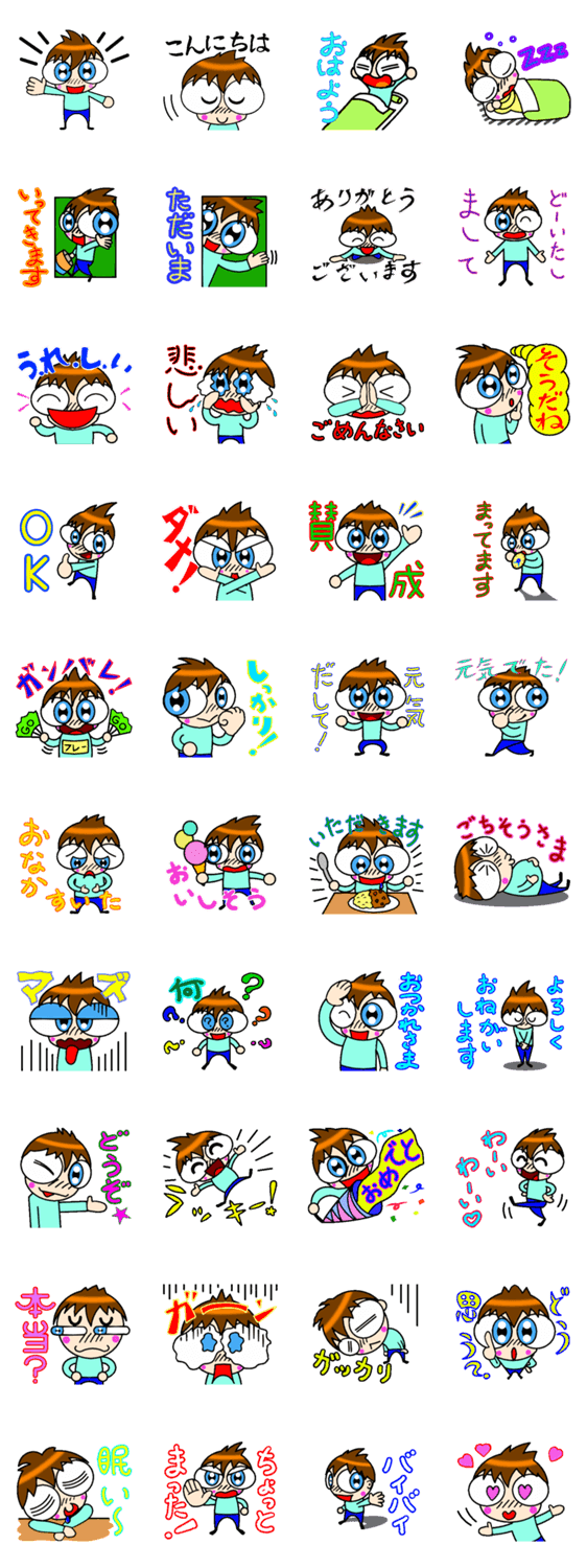 でか目くん。彼はとても大きな、でかい目の少年。そんな、キュートなかわいい彼で、日常のいろいろな会話を楽しんでください。