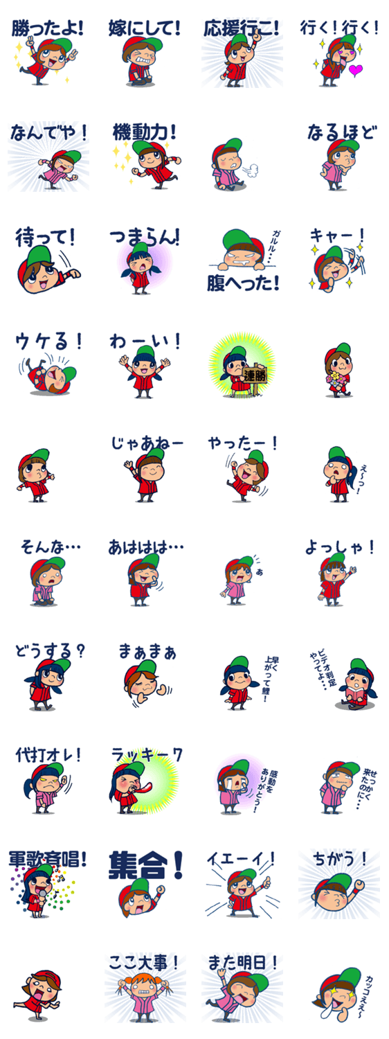 野球チーム応援スタンプ第三弾をリニューアル。生まれながらのファンも、にわかファンも、広島女子も、野球観戦でコミュニケーションできる日常会話を厳選!文字大きめ!