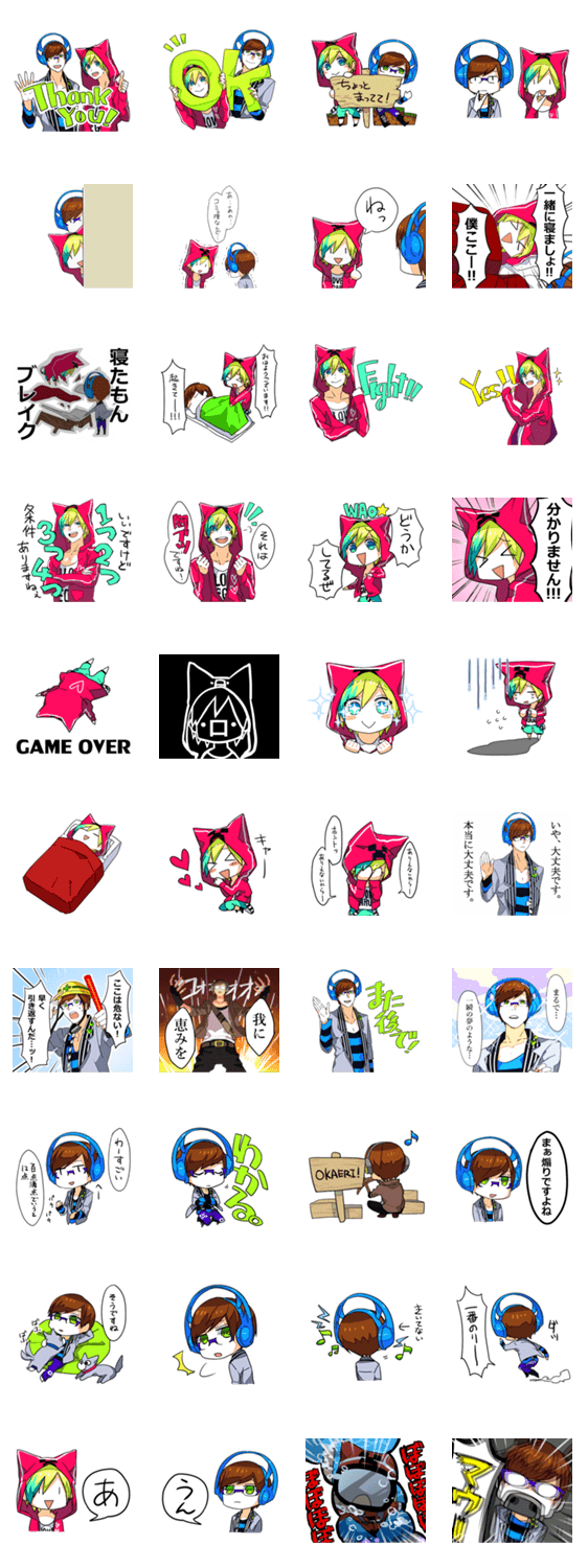 Youtubeで活動中のゲーム実況者「阿吽の二人組み」のl0ve&目軽のスタンプです。日常会話に使えるものの中には、分かる人には分かる動画ネタも…?
