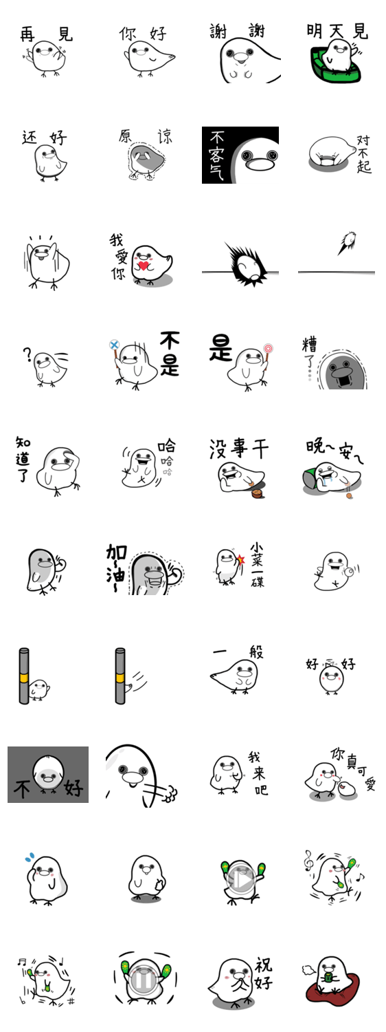 小鳥と一緒に中国語を使おう。中国語を知らなくても使いやすいスタンプだよ。
