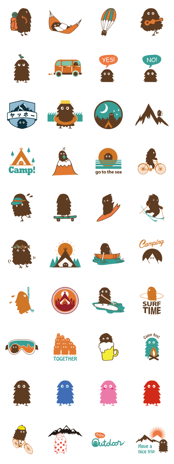 | スタンプ説明 | アウトドア好きのためのスタンプ!YETI(雪男)が山登り、サーフィン、キャンプ、スキーにスノーボード、サイクリングをするよ!マイヨジョーヌと山岳賞も! |
