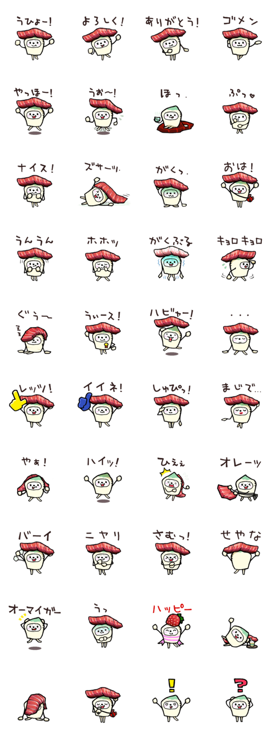 | スタンプ説明 | お寿司大好き!な、シャリの妖精?前作よりちょっと可愛いシャリの妖精。 |