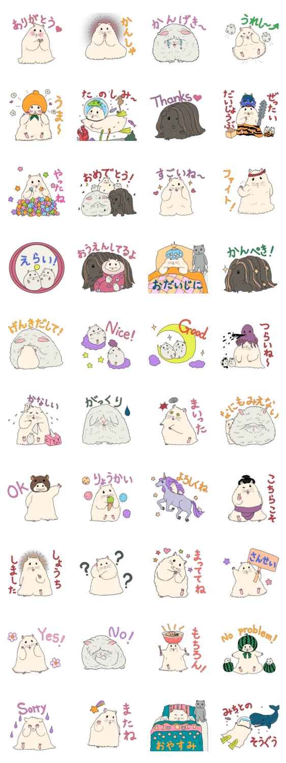 | スタンプ説明 | ハムスターたちやそのお友達が熊本へお出かけ。デコポン、スイカ、ラーメンなど堪能します。 |