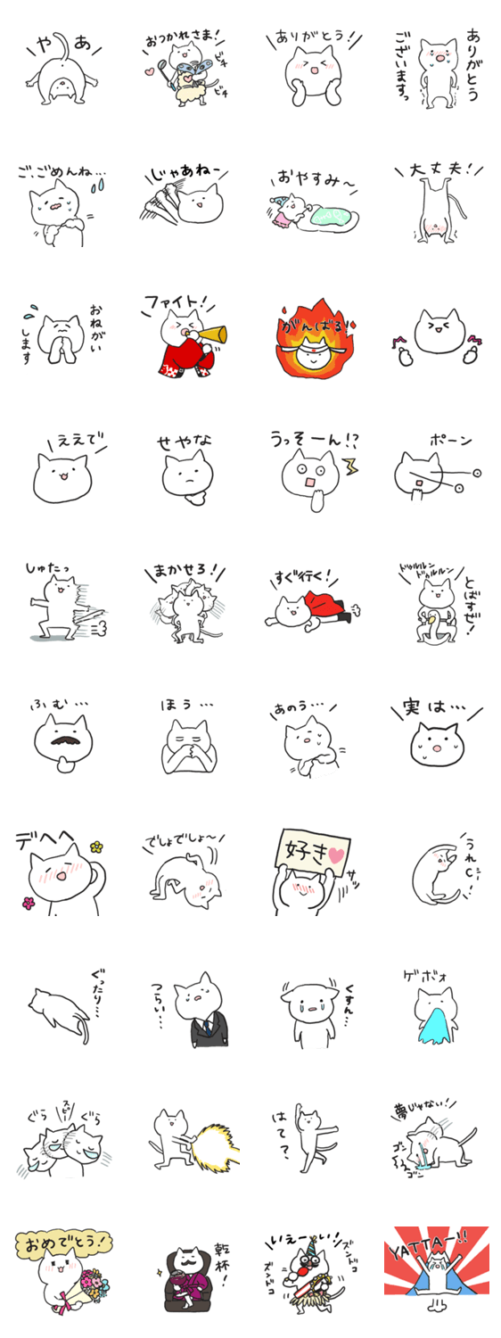 かわいくて時々シュール、伸び縮みするしろねこの、日常でよく使えるスタンプです。