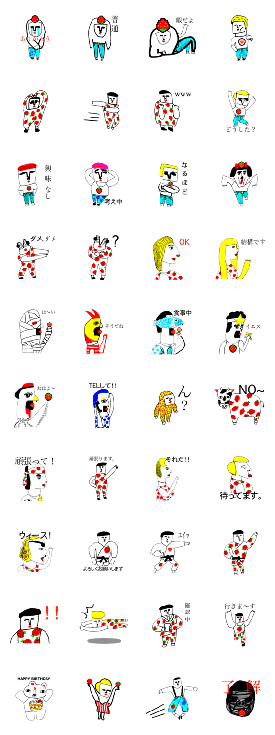 いちごの服の第二弾です。今回は苺好きの人々・動物たちが登場します。デニムによく合う苺の服や柔道着もあります。