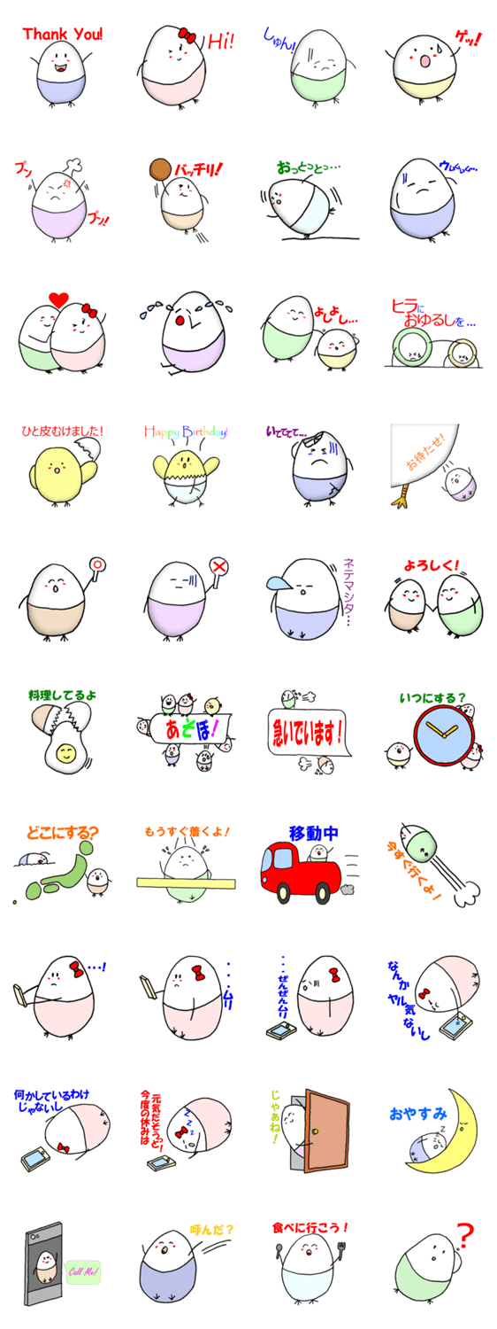 | スタンプ説明 | 虹色の一色をまとった7人のかわいいタマゴのスタンプです。 |