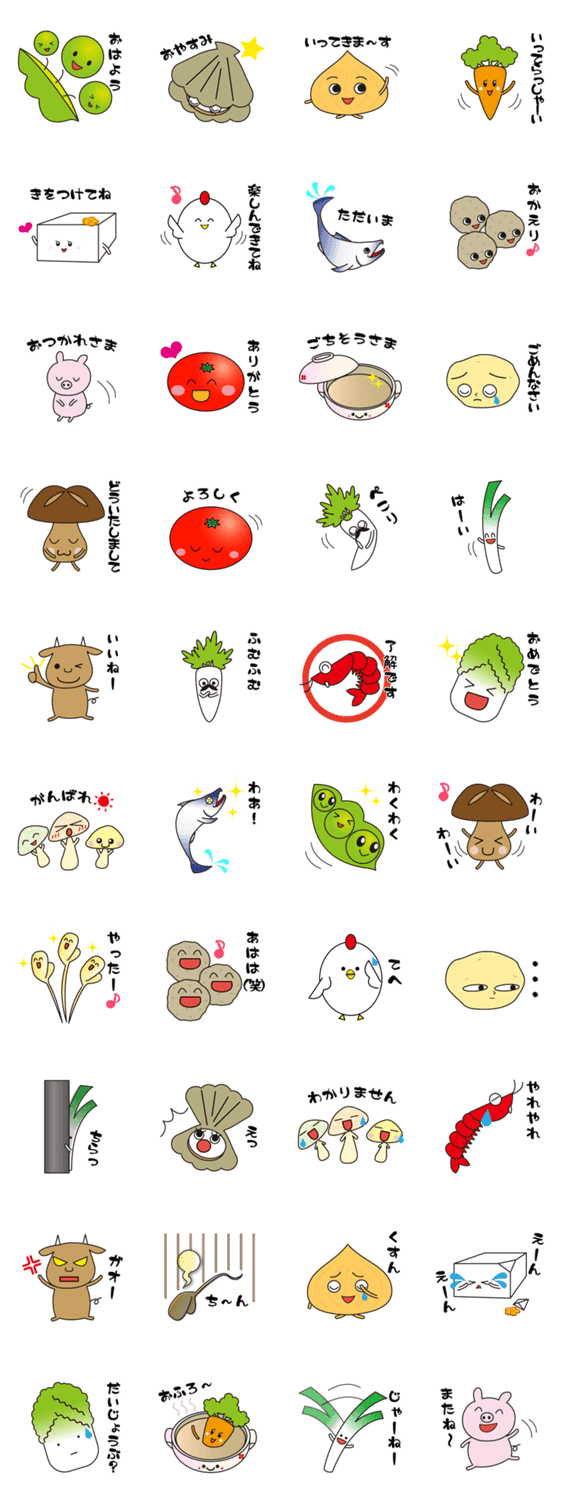 よせなべの仲間たちのスタンプです。日常でよく使う言葉を集めた、使いやすい基本のセットです。
