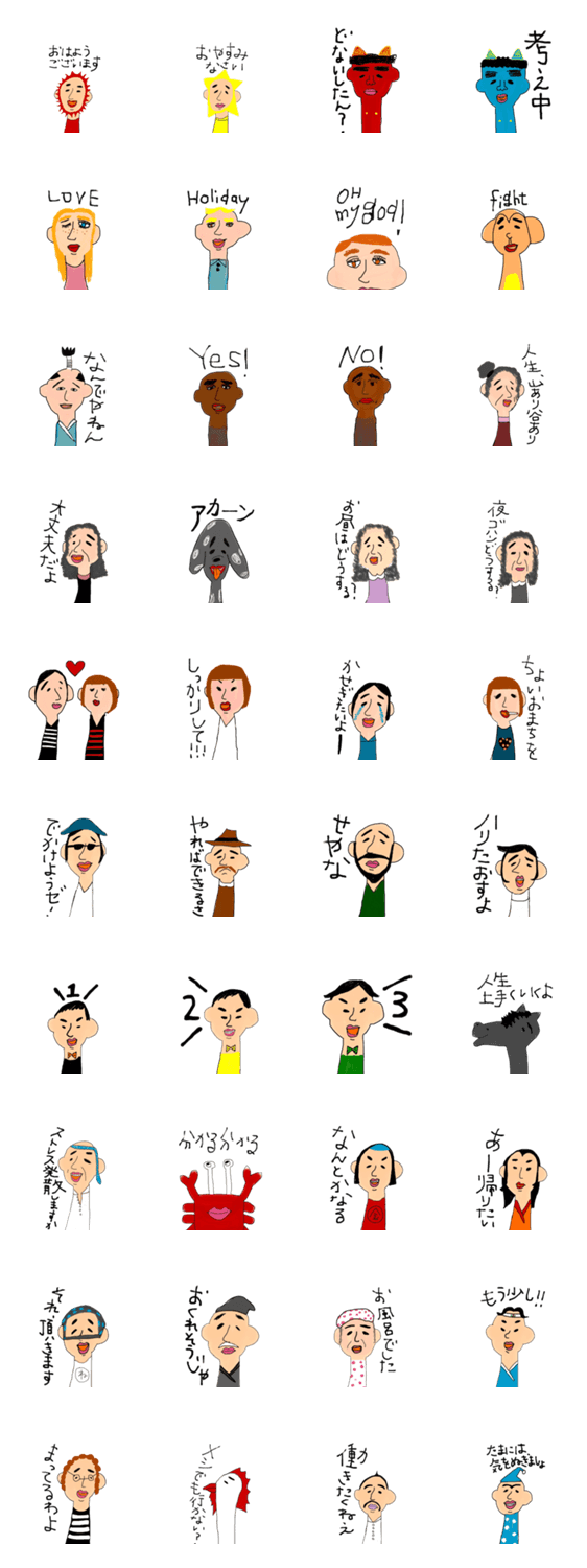 日本昔ばなしに出て来るような人達と世界の人達のスタンプです。