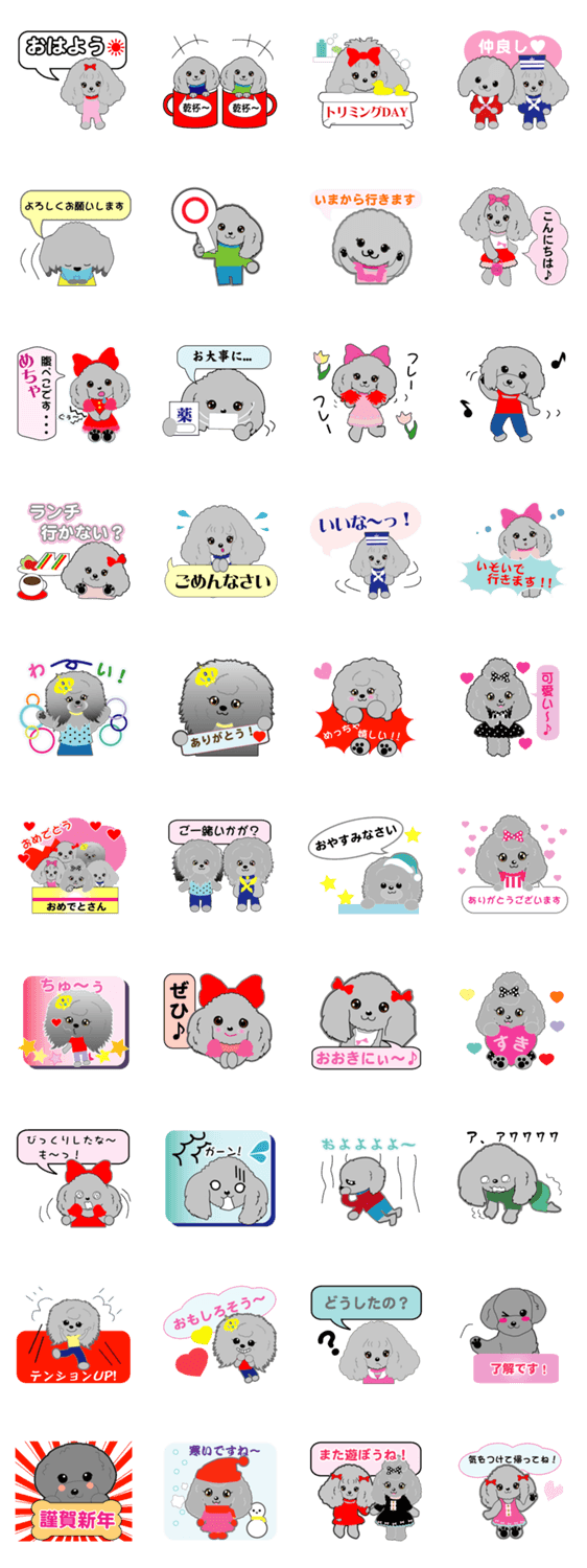 可愛く、ちょっと笑えるところもある日常で使えるスタンプです。愛らしいシルバープードルの魅力で毎日を楽しくしてください。