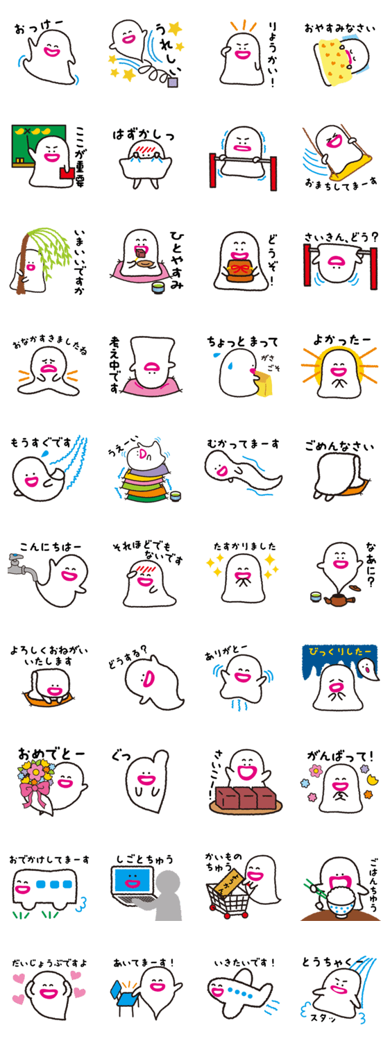 ようかんが大好きなまったりしたおばけちゃんです。おばけちゃんスタンプを使ってまったり気分になってくださいね。