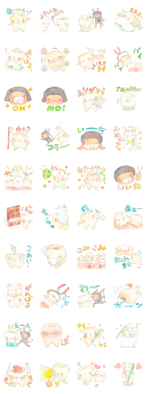 甘いものが大好きな歯っぴーはっちゃん。でも歯磨きは忘れずにね。歯医者さんにおすすめな?こばやしあやの水彩スタンプです。