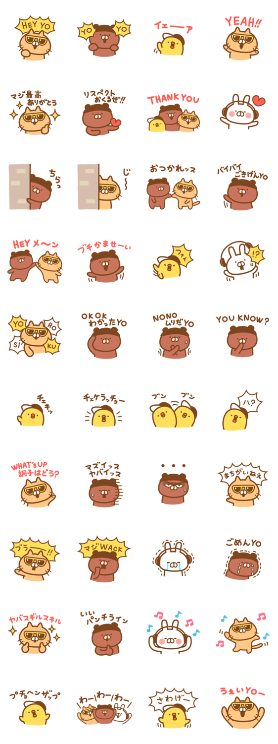 ヒップホップが大好きなうさぎ、くま、とり、ねこによる「ヒップホップラップ」のスタンプです。