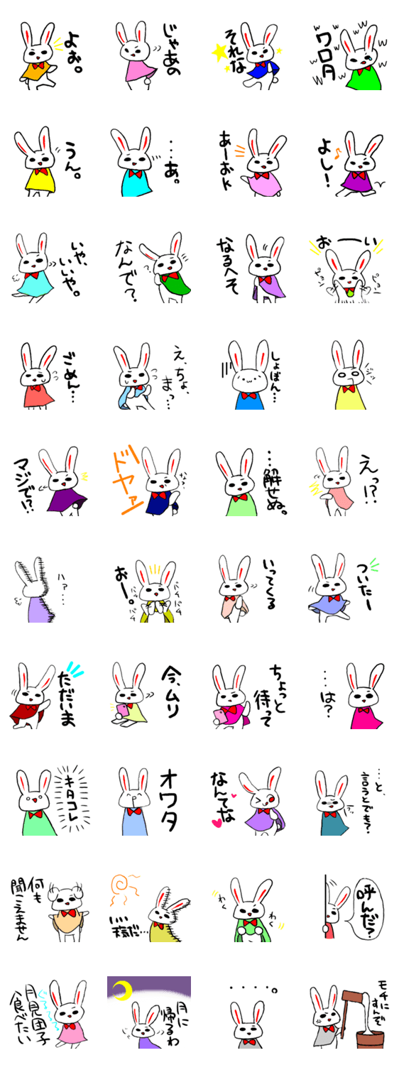 | スタンプ説明 | ジト目のうさぎがあなたの日常にお邪魔します。無表情ですが、そこが可愛いうさぎです。可愛がってあげて下さい。 |
