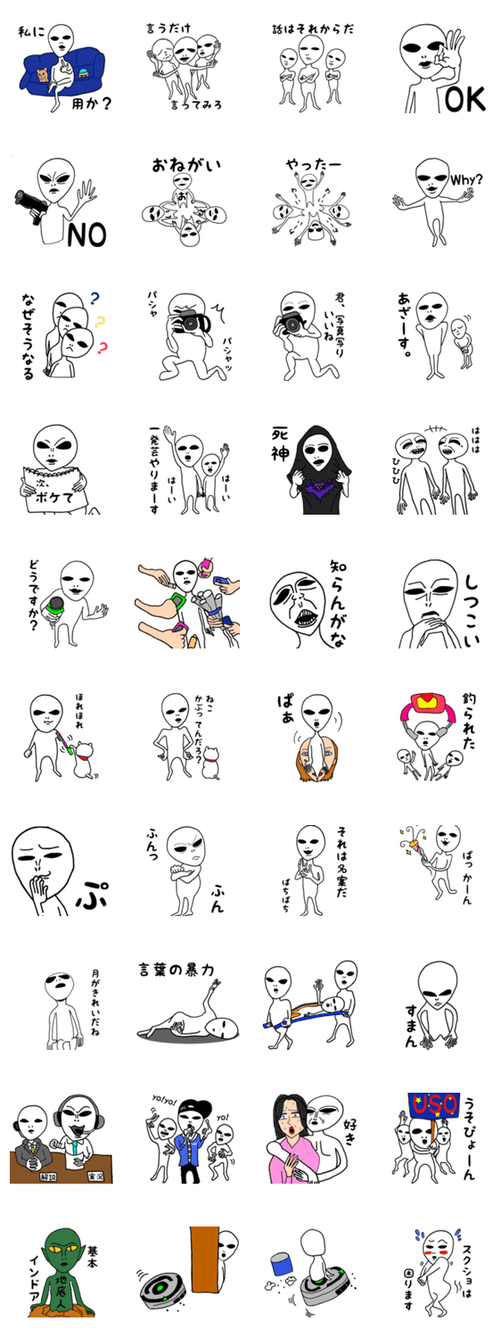 自由気ままな宇宙人のスタンプです。友達、家族との会話にお使いください。