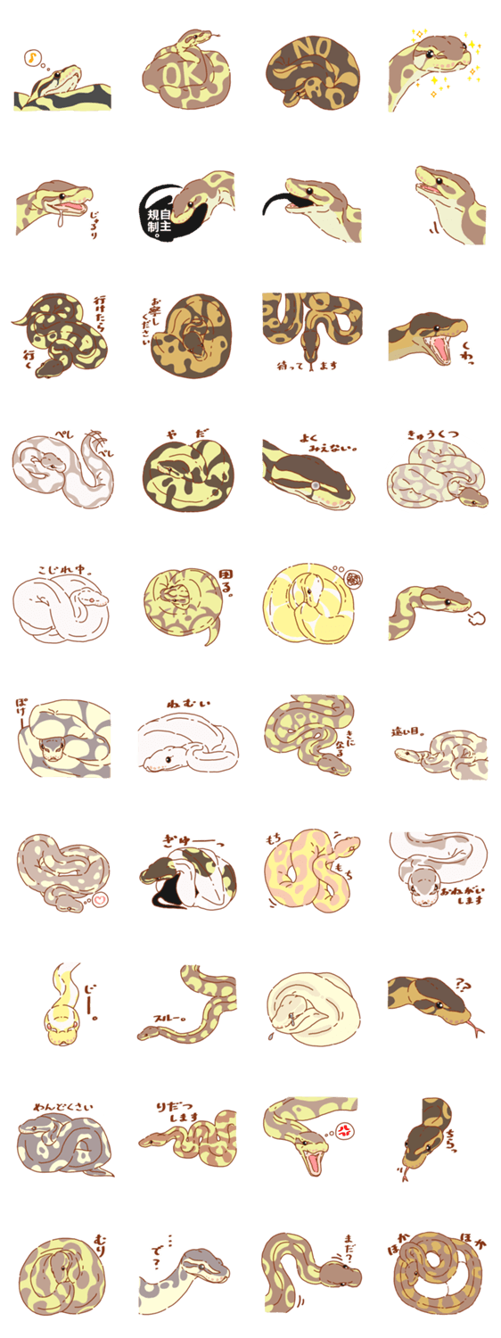 うるうるした瞳ともちもちボディが可愛いボールパイソンのスタンプです。とてもマイペースでちょっと臆病です。
