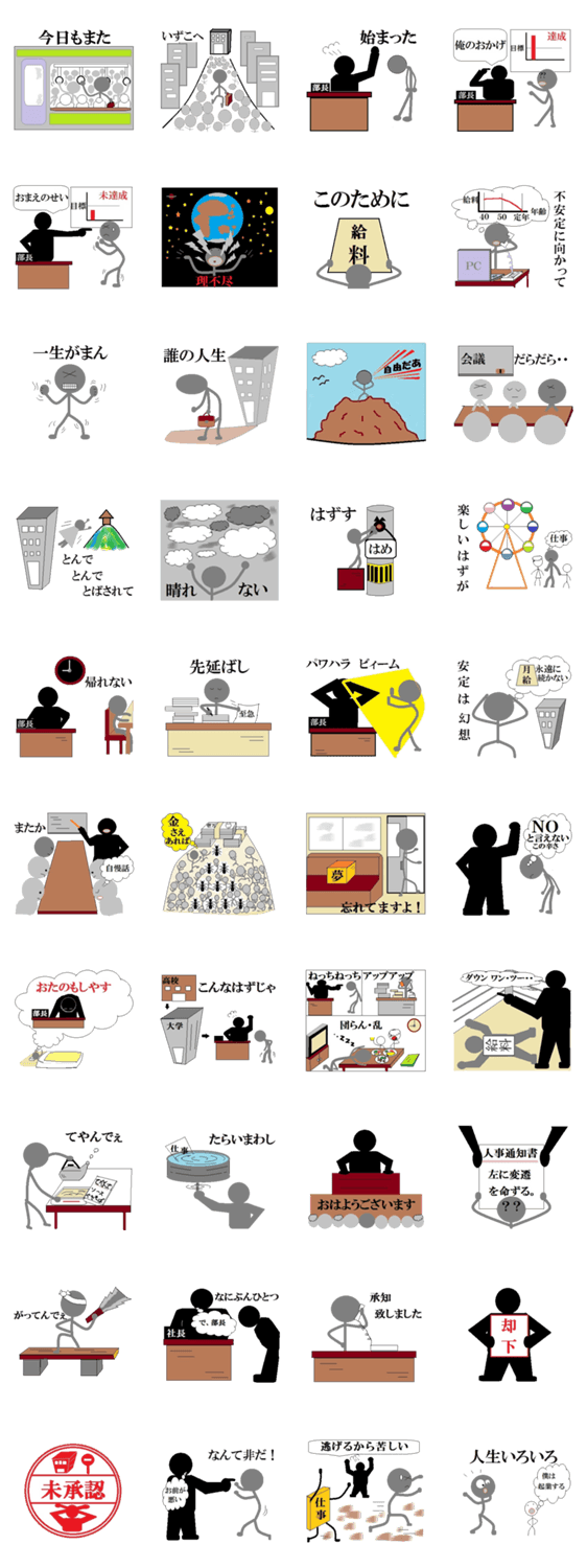 理不尽な日常、心から楽しんだり、喜んだりできない・・そんなサラリーマンの晴れきれない気持ちをスタンプにしました。