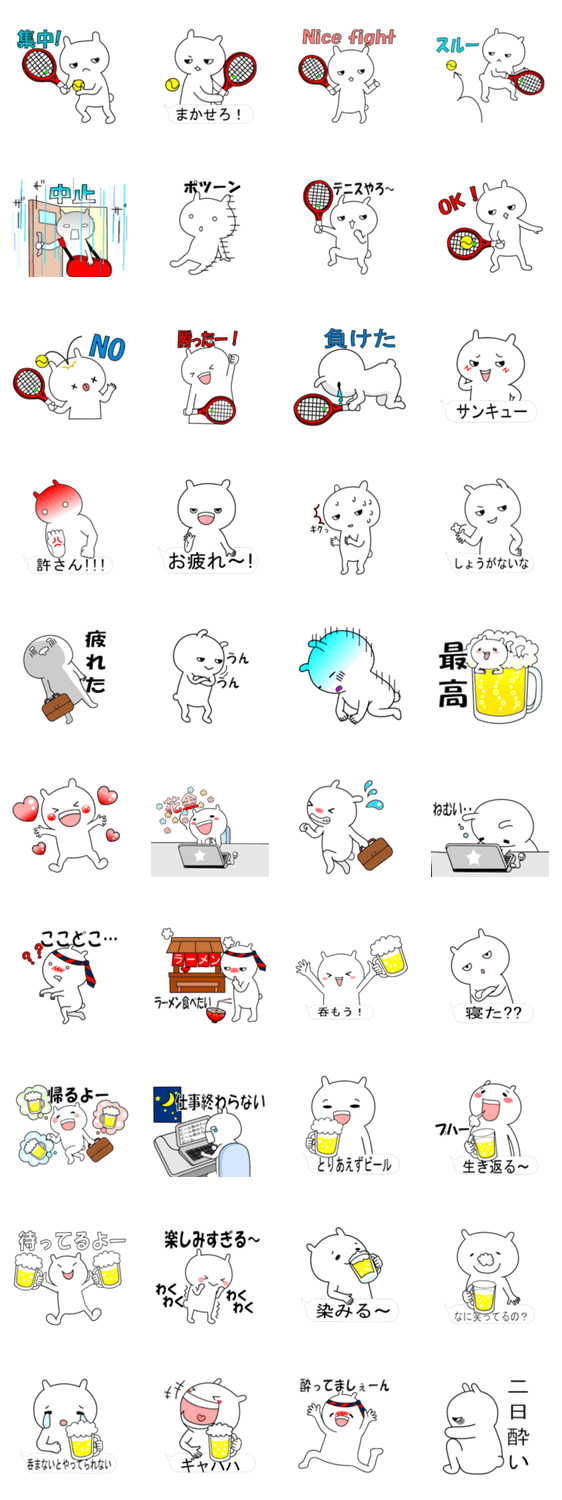 テニスとビールを愛する大人向けスタンプです。 猫のようなうさぎのキャラクターです。時々仕事も頑張ります。