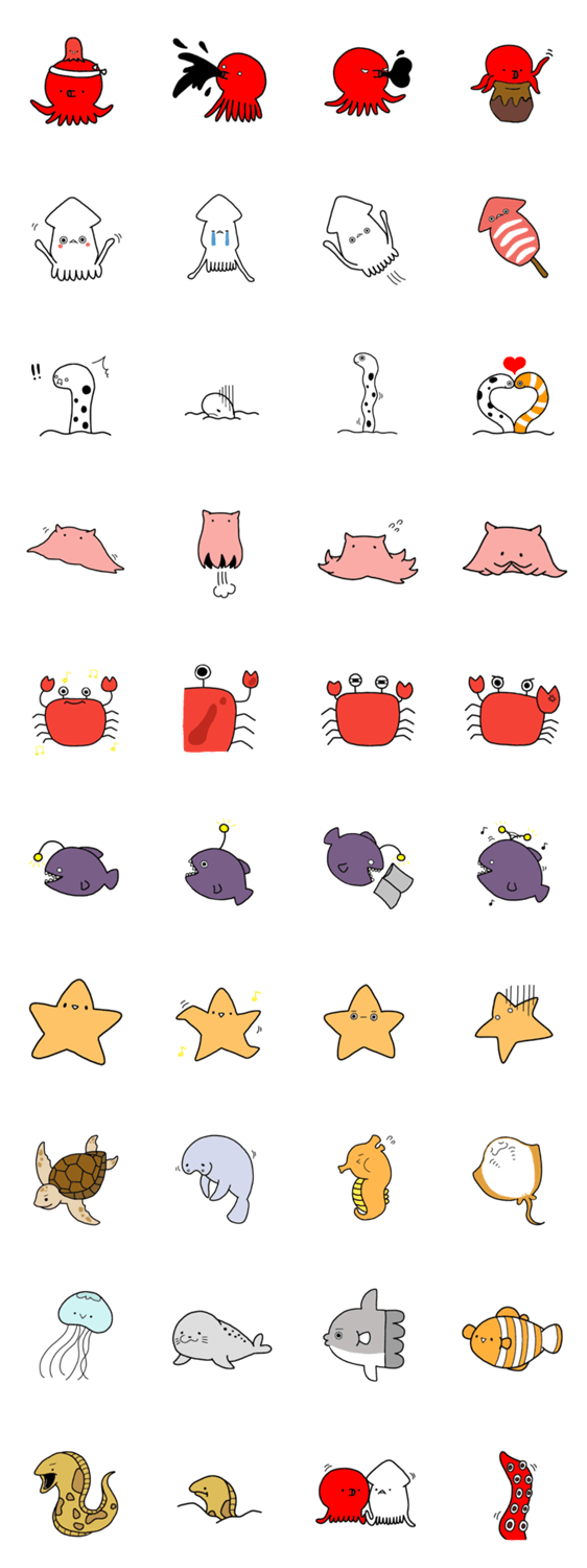 いろいろな海の生き物たちのスタンプです。タコ、イカ、チンアナゴ、メンダコ、チョウチンアンコウ・・・