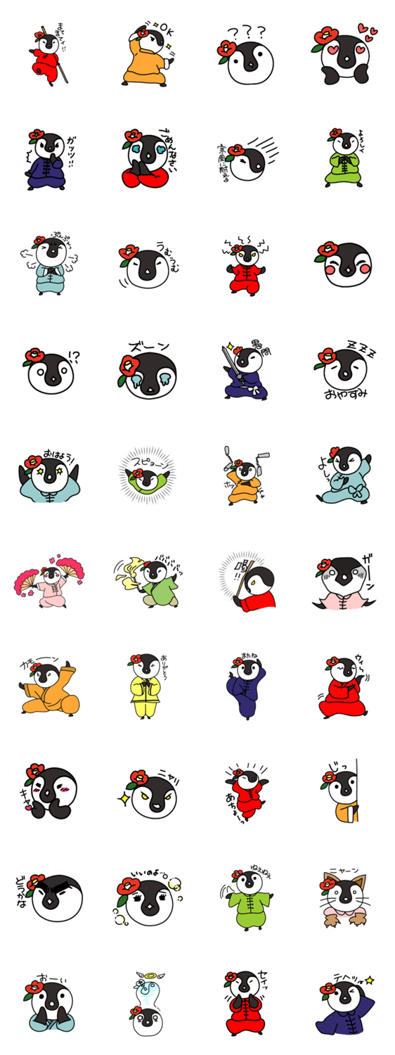 カンフーをするペンギンの子供のスタンプです。可愛い椿を髪飾りにしています。