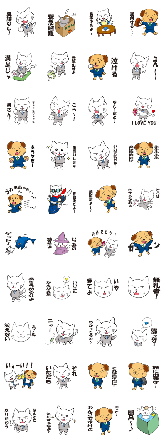 会社の同僚の二人、猫の「むん太」と犬の「でに郎」の日常をスタンプにしました。一応パート2です。色んな場面で活躍させてあげてください。