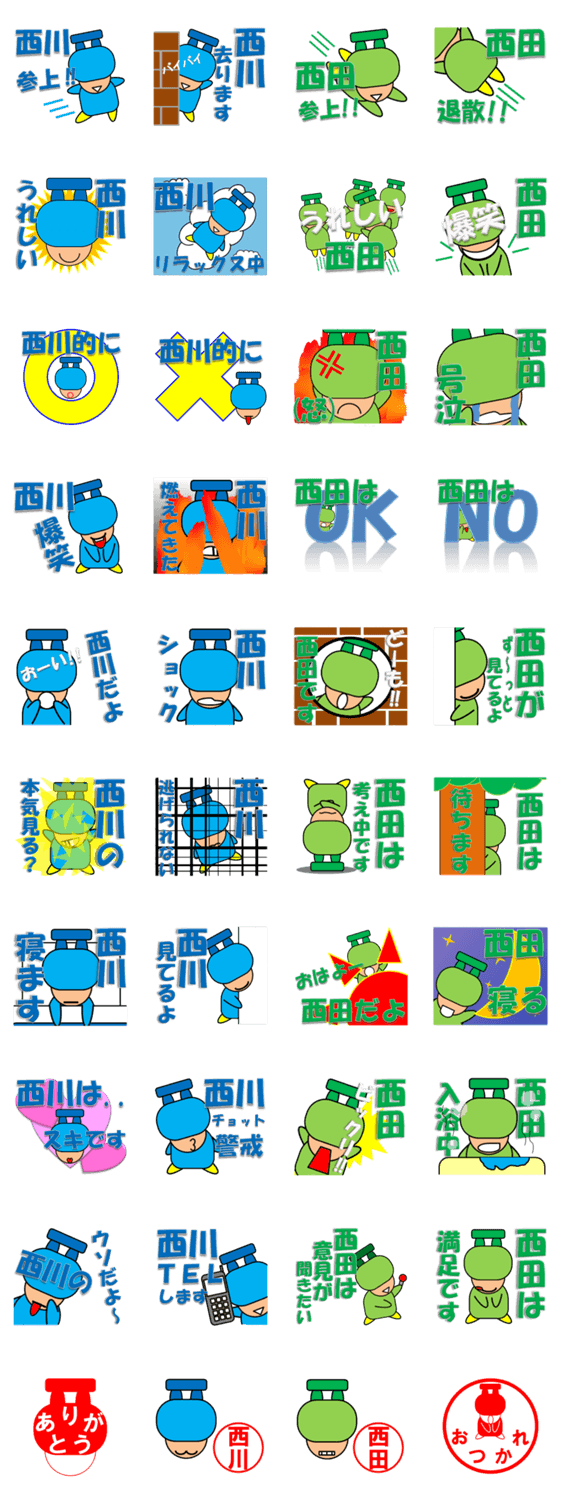 「西」のつく人の苗字のスタンプです。西川さんと西田さんに使ってね。学校の友達や部活の仲間、主婦仲間との会話に使ってください。サラリーマンの方、会社でもどうぞ。