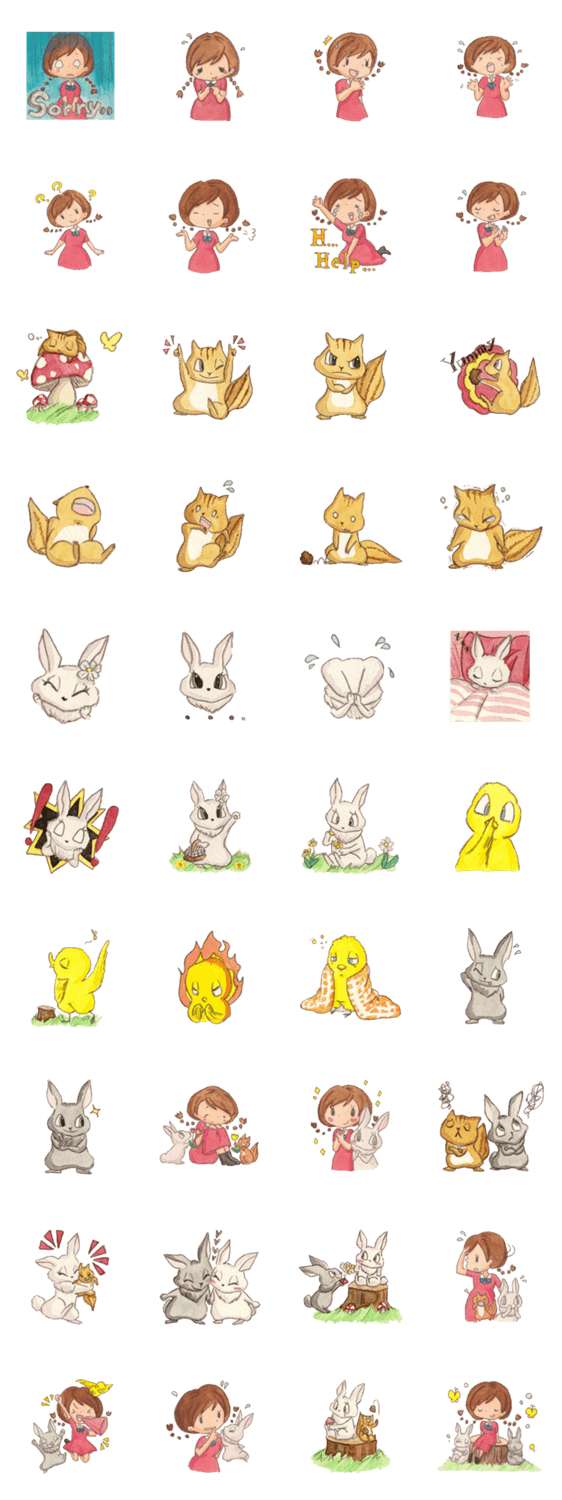 森の小さな動物たちと女の子の水彩イラストスタンプです。