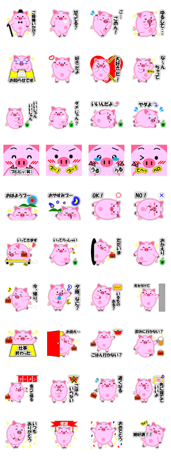 第3弾!いつもお気楽でラーメン好きなブタ丸。あいさつ・返事もあり、サラリーマン風で楽しく使いやすいです。パパ、旦那さん、彼氏にもおすすめ☆~ちょこるスタンプ18~