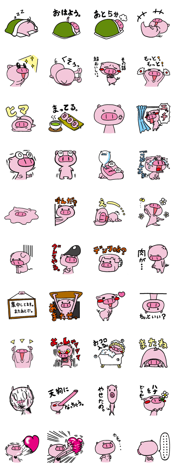 おかしくて愛らしい、ブタさんの日常のスタンプです。
