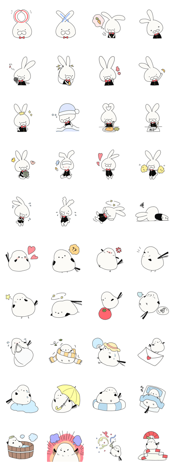 まっしろシマエナガとうさぎさんのゆるゆるスタンプ。 文字なしなのでいろんな場面で使えます◎