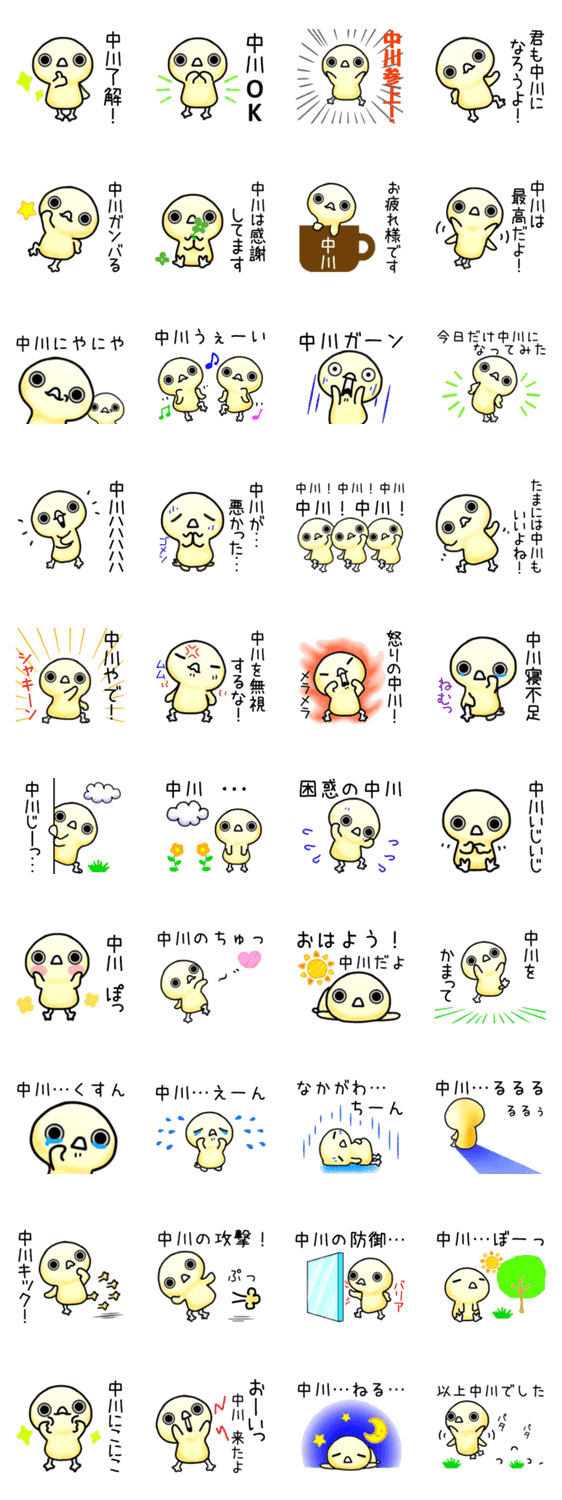 ひよこの中川さんスタンプです。中川さん以外の方も使えます。あなたも中川さんになってみよう。