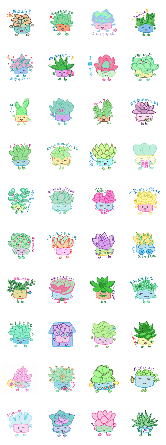 いろんな種類の多肉を揃えました。日常で使える文字を多く入れました。