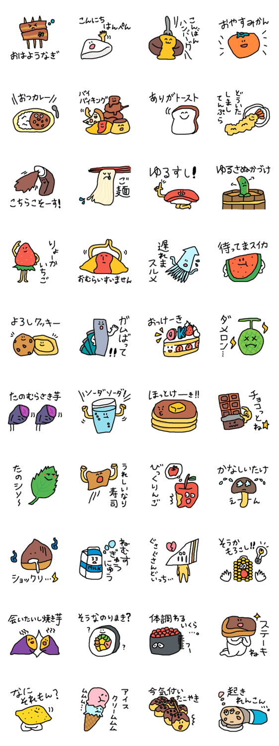 ダジャレのスタンプです。食べ物だけです!黒背景でも使えるようになってます!なんか茶色い食べ物ばっかですいません、もっと野菜を食べましょう。