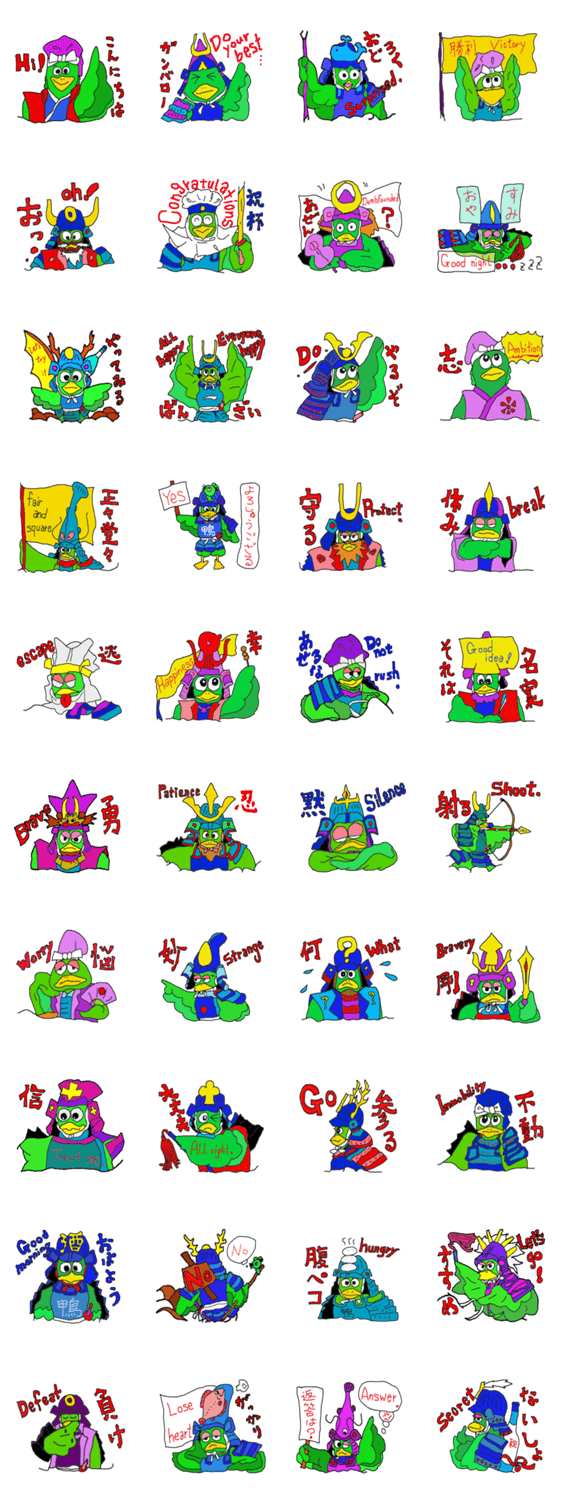 鴨之助は侍にあこがれて変身してしまった鴨です。きらびやかなコスチュームで頑張ります。日本の侍、鴨之助がスタンプに成ってやって来ました。