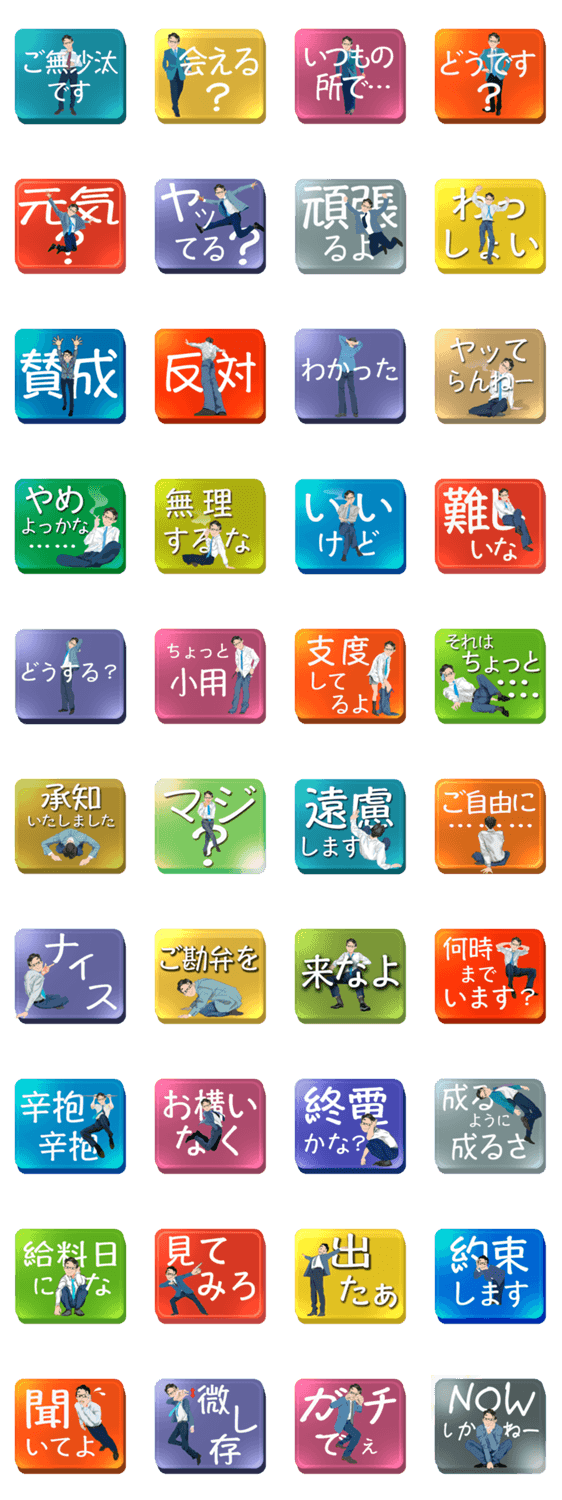 サラリーマンの為の使えるスタンプです。会話満載なので、皆がいろいろなスチュエーションで使用できます。