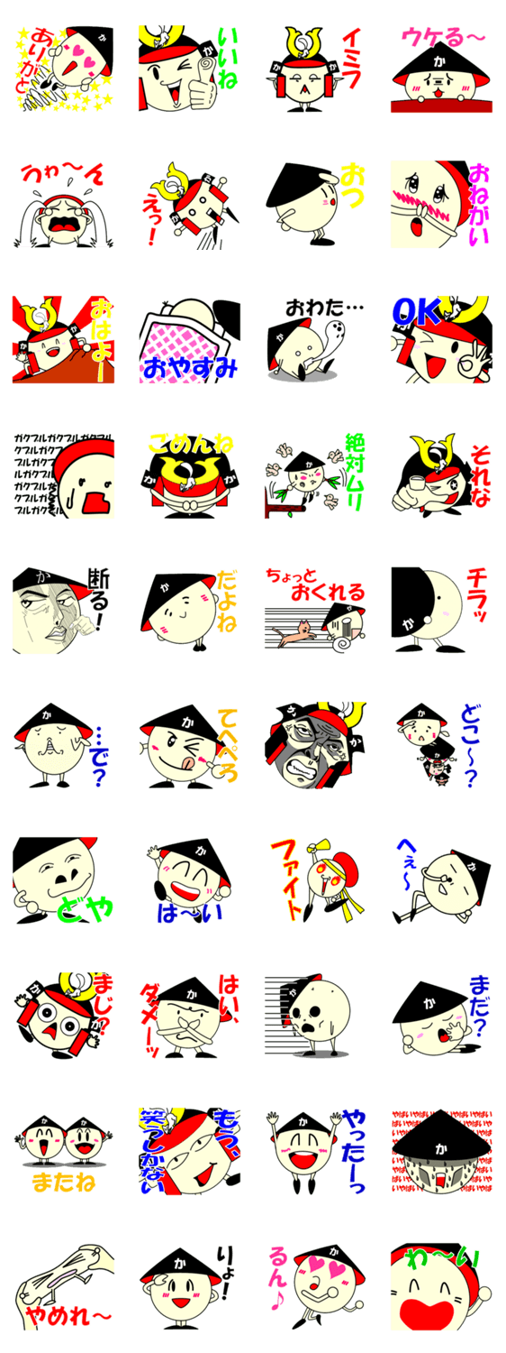 | スタンプ説明 | 鹿児島県姶良市加治木町のソールフード「かじきまんじゅう」のキャラクター「かじまんくんと足軽隊」。かもだ通り商店街が応援しています。みんなで楽しみましょう。 |