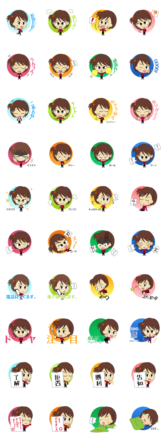 活発な女子をモチーフにしたカラフルなスタンプです。かわいくてカラフルなスタンプで会話に彩りを!