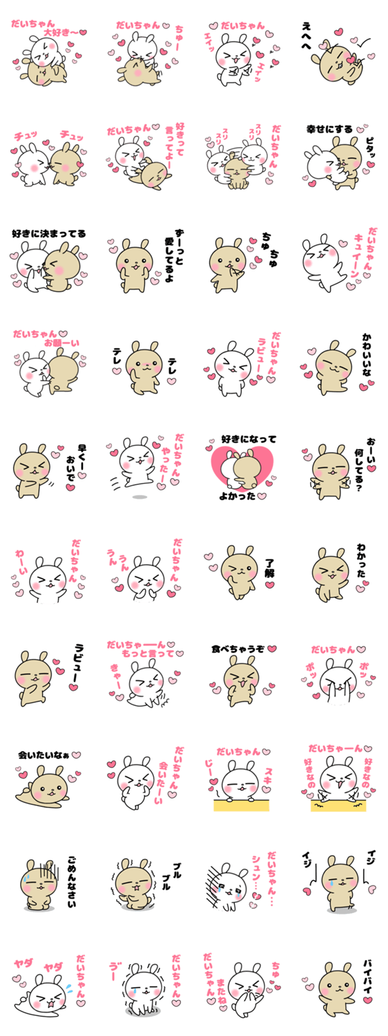 名前に「だい」の付く人に使えるスタンプ♡大好きなだいちゃんに一生懸命アピールしてます♥それに答える、だいちゃん目線のスタンプも入ってます。二人で仲良く使ってね♡