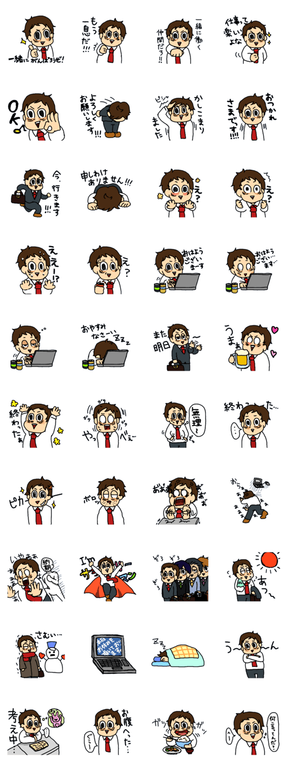 日々、一生懸命働く社会人のみんなに送るスタンプ。顔は笑っていても腹の中で渦巻く感情! 先輩、同期、後輩に宛ててご使用ください。