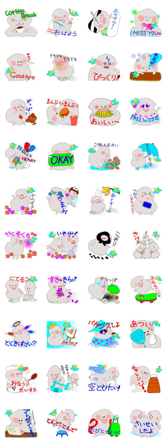 ステッカーはプらっチのカワイイ日常生活を現しています。彼の容姿はプラナリアに似ています。キャラはとても活動的でおもしろくて心優しいです。蝶の親友がいます。