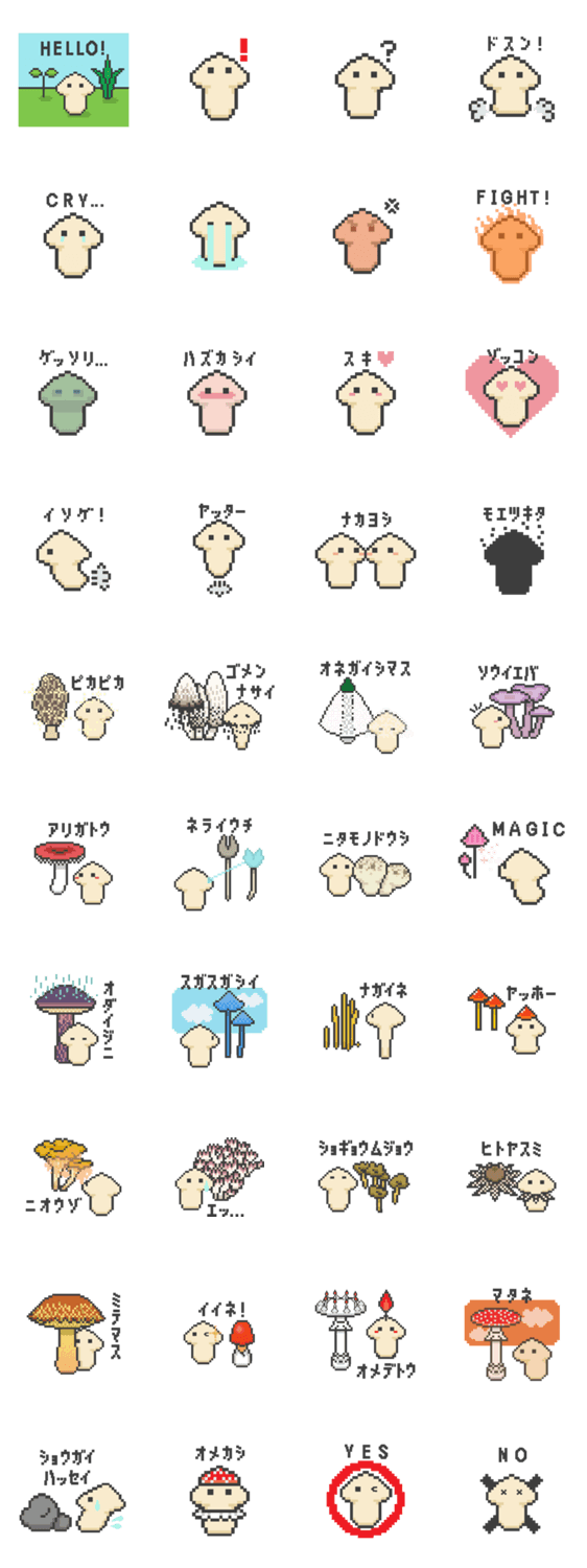 | スタンプ説明 | きのこの精は山で生まれた、山のきのこを見守る存在です。これはきのこの精と、きのこの精がいつも見守っている山のきのこたちのスタンプの、ゲームバージョンです。 |