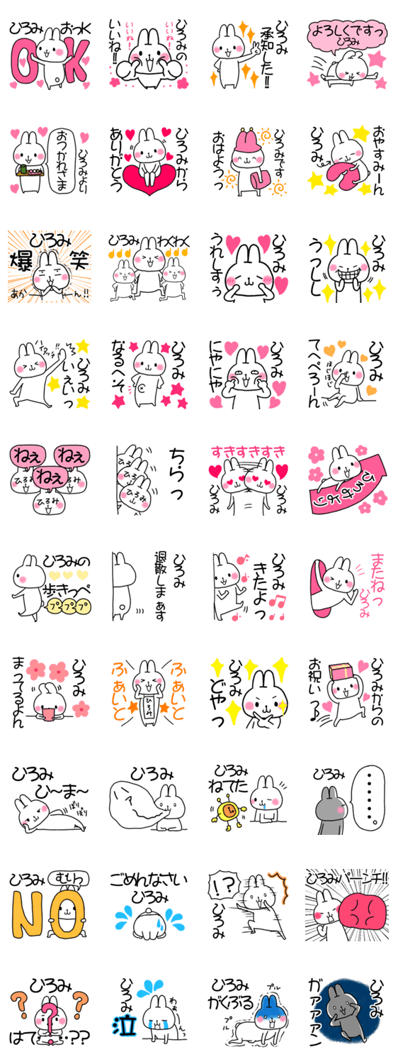 | スタンプ説明 | ひろみちゃん、ひろちゃんが日常的に使える専用の便利なかわいいうさぎの名前、あだ名スタンプ♡彼氏彼女のカップル友達家族夫婦に毎日使える♡ぽぽんのスタンプ第69弾♡ |