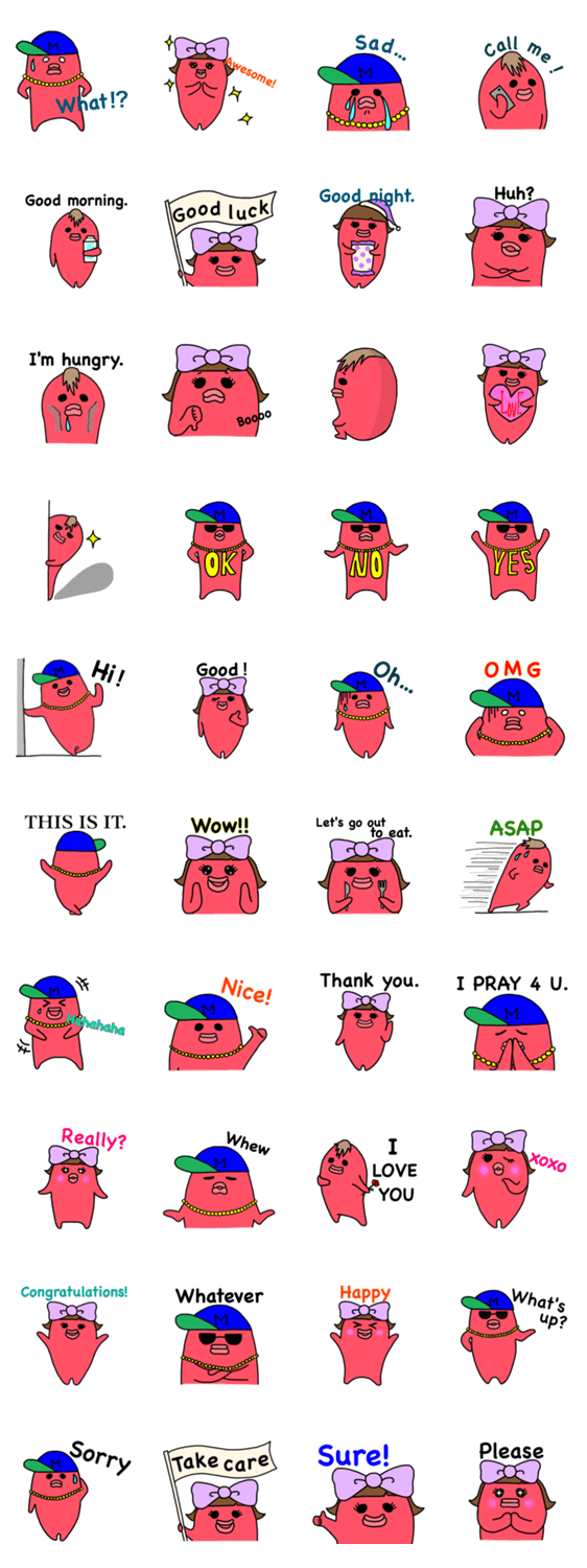| スタンプ説明 | 博多名物の明太子から生まれたMr.MENTAMANとcoddyちゃん。今回は英語ver.です!外国のお友達にはもちろん、coolに決めたい時に使っちゃえYO! |