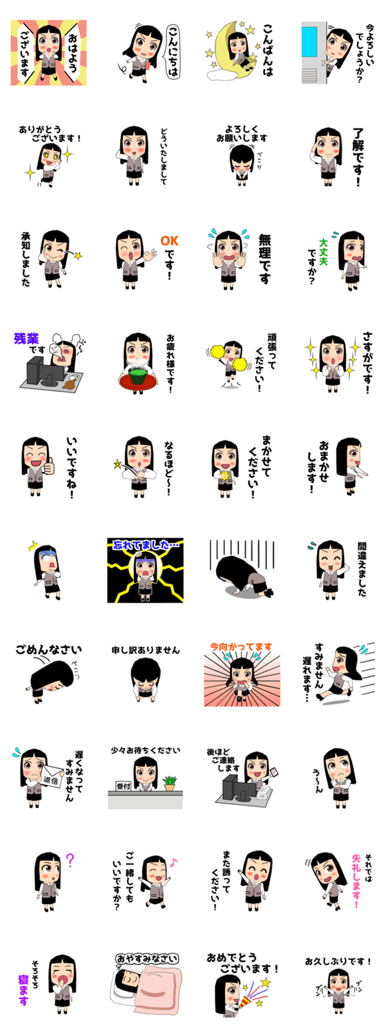 仲が良い職場の先輩などに使えるかわいいOLさんのスタンプです。日常会話で使いやすい言葉を集めました。白ふち付きなので背景を気にせず使えます。