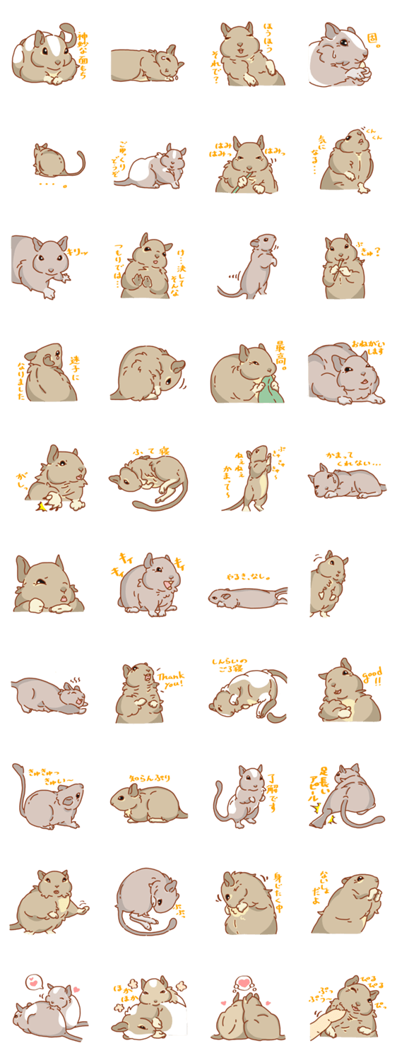 リスでもウサギでもハムスターでもない、彼らの名はデグー。鳴き声で感情表現するねずみ、デグーのにぎやかで可愛いスタンプ。