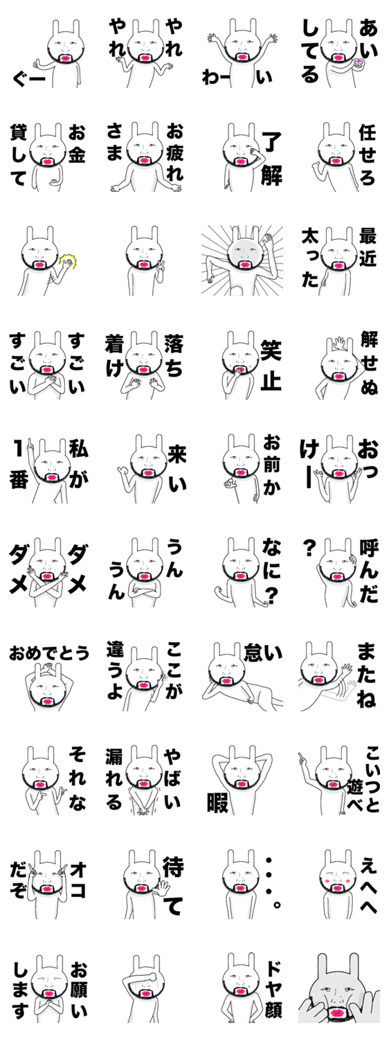 ウサギだけど人面。真顔でおっさんの顔をしている。キモかわいい???たまにとても素敵な笑顔をします。たまに武士語を使ったり。