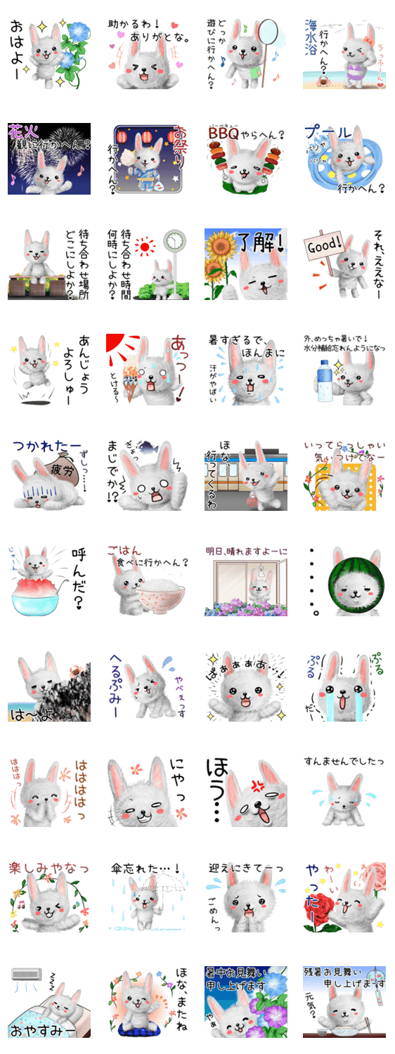 初夏(梅雨)や夏向けのイラストが多めのちょっとリアルなウサギのヌイグルミのスタンプです。セリフは関西弁バージョンです。