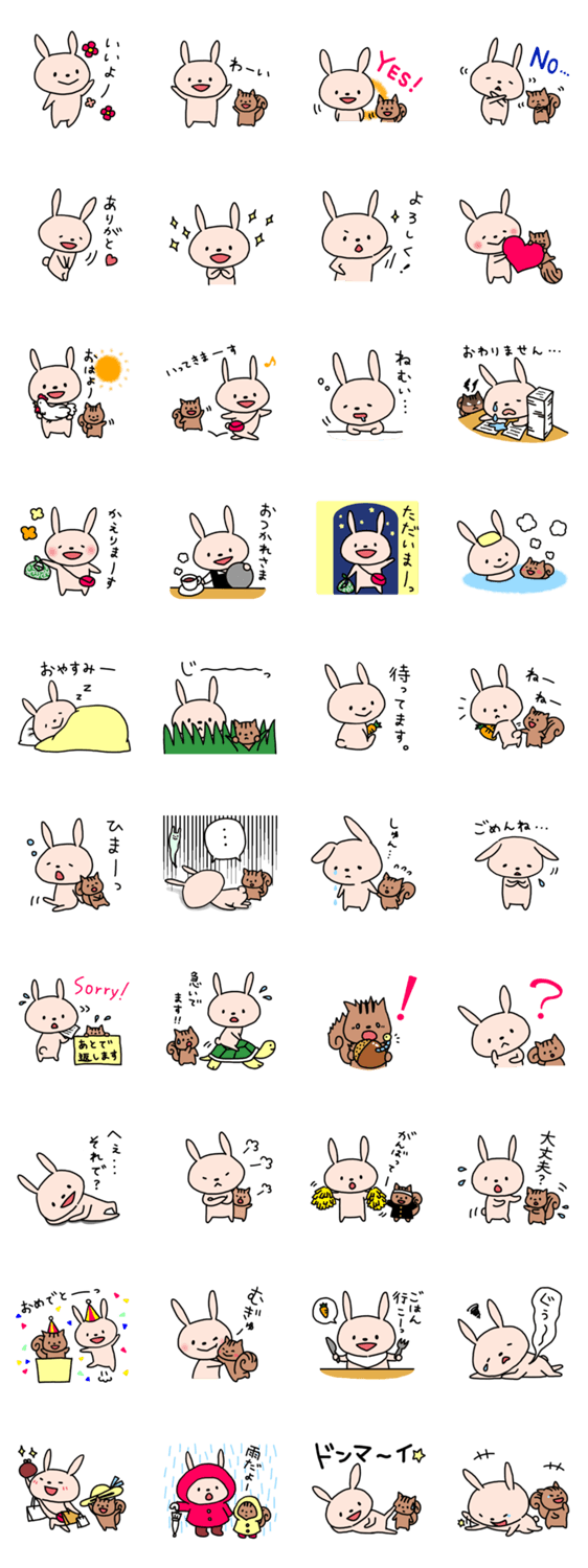 うさぎとりすのスタンプです。うさぎがたまに謎ポーズ。