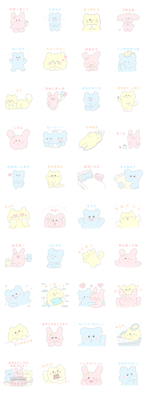 わたでできている動物たち。ねこ、くま、うさぎがいます。こころもメッセージもふわふわにします。